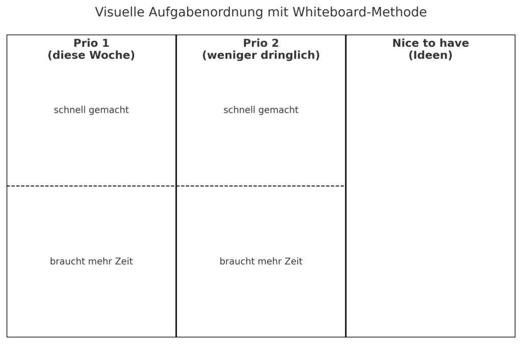 Ich arbeite gerne mit einem echten Whiteboard und magnetischen Post-its. Selbstverständlich funktioniert hier auch die digitale Version wie Miro. So entsteht eine klare visuelle Struktur: